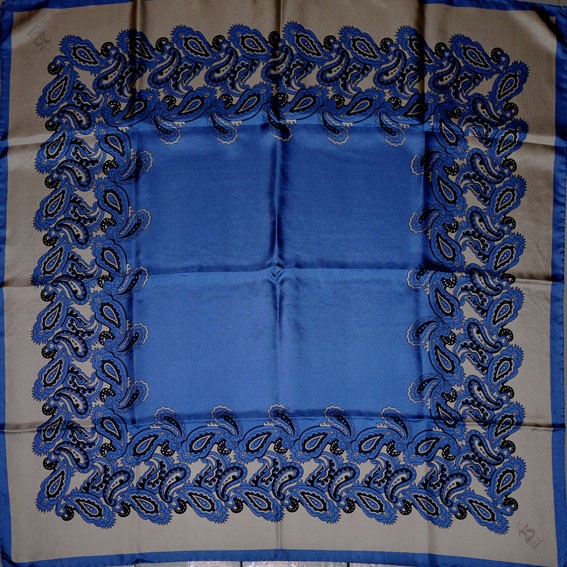 cornflower blue and black paisley design on silvery grey ground,
