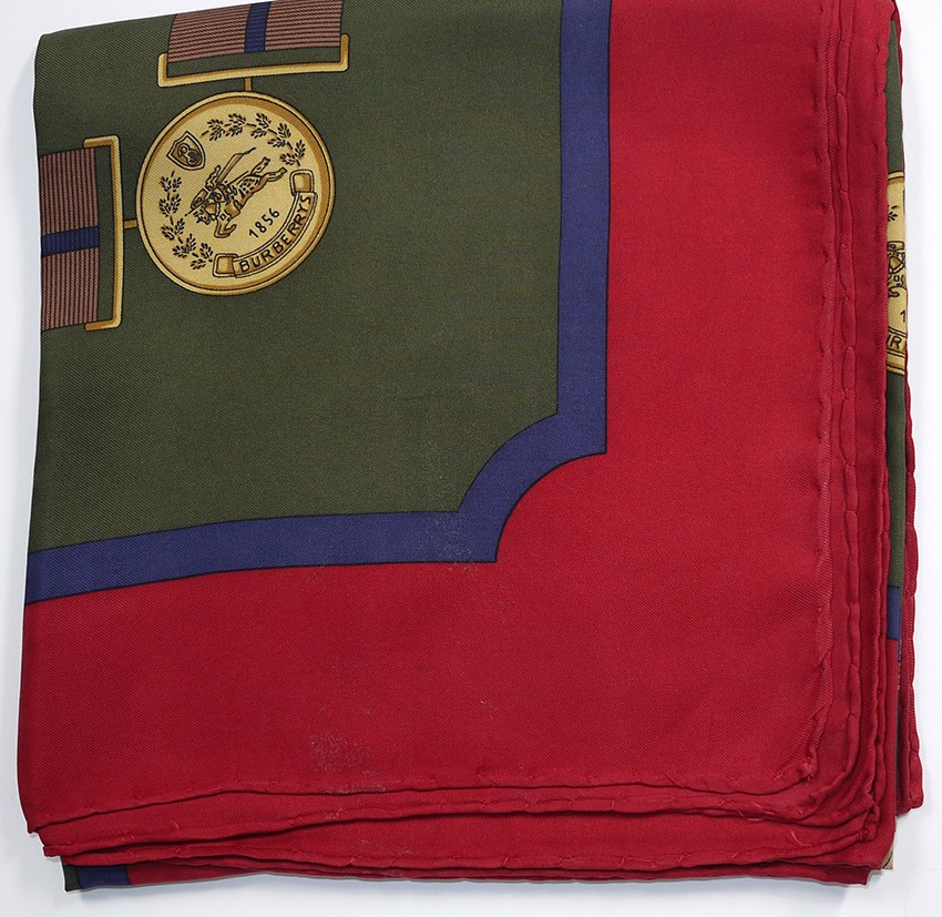 BURBERRY classic silk scarf, olive, gold, burgundy,