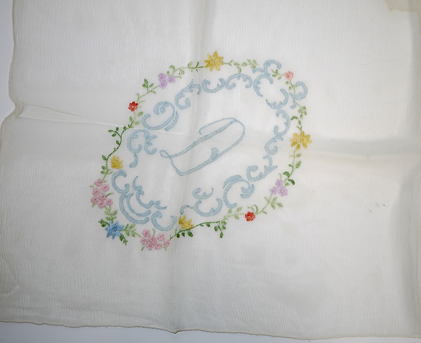 fine ivory silk chiffon scarf, embroidered with a D motif within a floral cartouche,