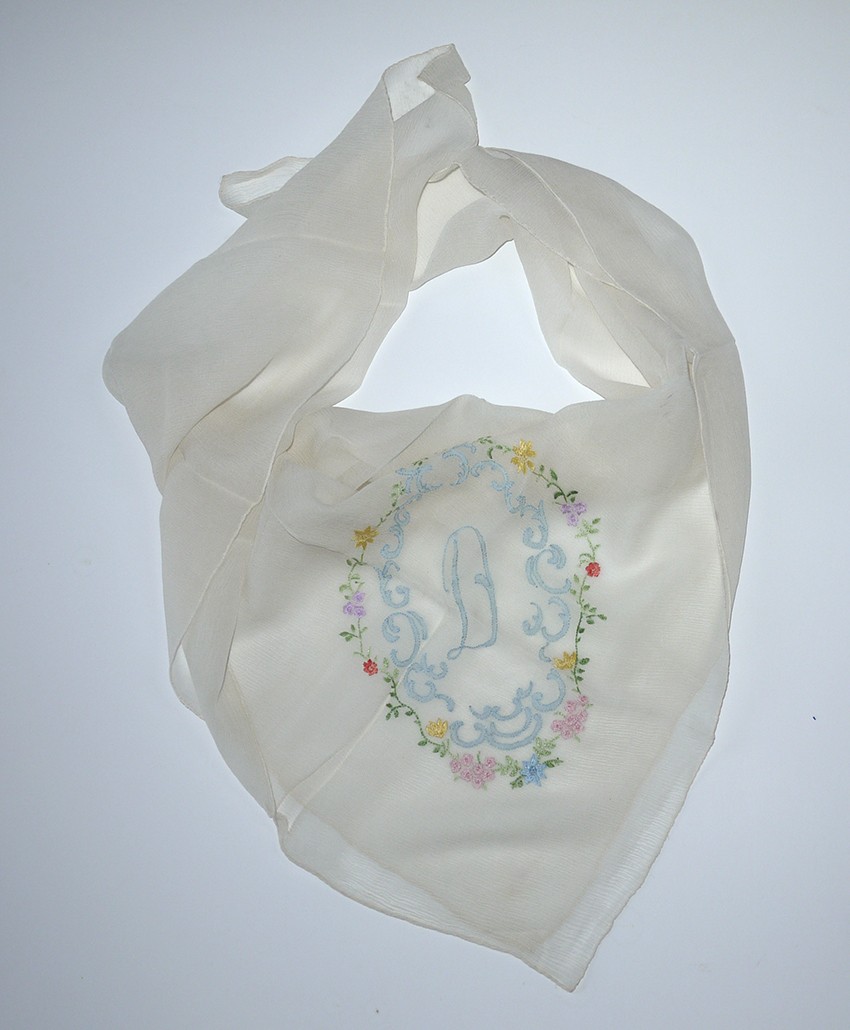 fine ivory silk chiffon scarf, embroidered with a D motif, c.1920s