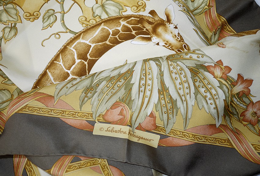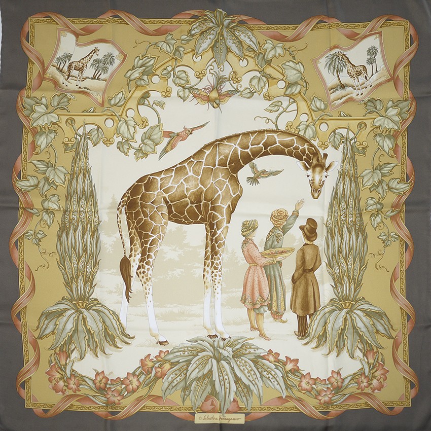 Salvatore FERRAGAMO italy silk scarf, giraffe and admirers