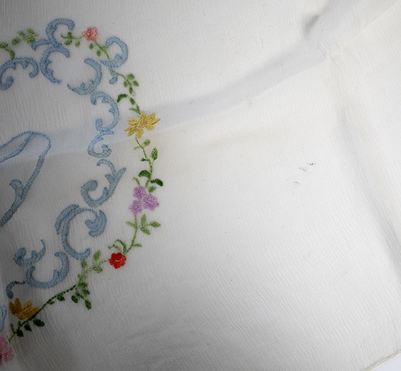 fine ivory silk chiffon scarf, embroidered with a D motif, c.1920s